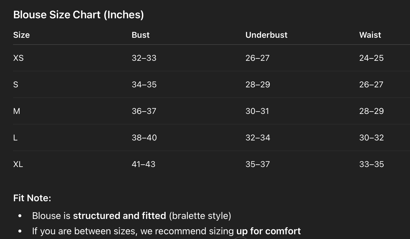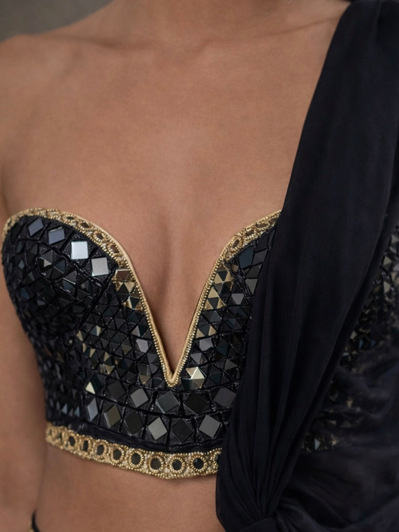 Blouse: Bralette-style, structured fit Work: Hand-embroidered mirror and bead detailing Skirt: Pre-draped lehenga with saree-inspired drape Fabric: Lightweight georgette (skirt), embellished base (blouse) Color: Deep Midnight Black with gold accents Closure: blouse hooks